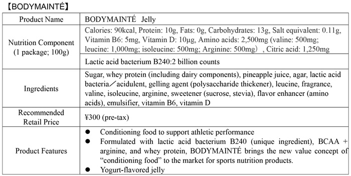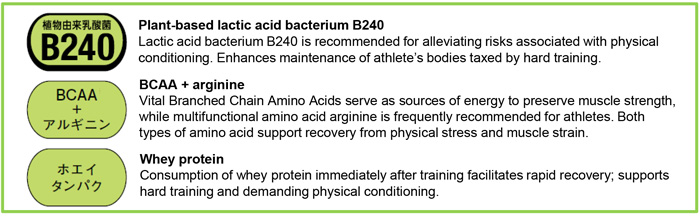 Athletes who pursue rigorous training regimens may be at risk of illness due to lowered immunity, leading to concerns about appropriate volume and intensity of conditioning in preparation for competition*3. Aware of these and other concerns about athlete's physical condition, Otsuka Pharmaceutical developed new BODYMAINTÉ Jelly, formulated with lactic acid bacterium B240 (a strain licensed to Otsuka Pharmaceutical), BCAA + arginine, and whey protein. Contributing to maintenance of optimum physical condition and recovery from exercise stress, BODYMAINTÉ Jelly supports conditioning for maximum performance.