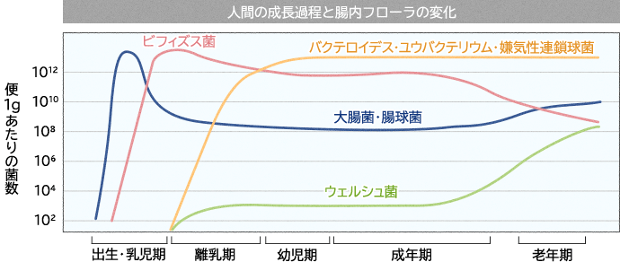 腸内の細菌群は、年齢とともに変化します。年をとると悪玉菌の割合が増えてきます。