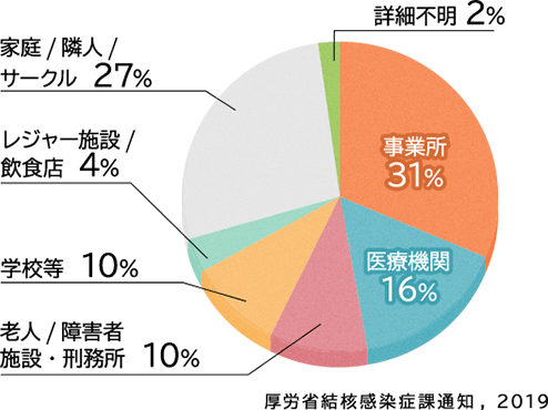若い世代で結核に対する抵抗力(免疫)をもたない人々が増えたこと、診断の遅れなどによる集団感染・院内感染が増加しています(図2)。