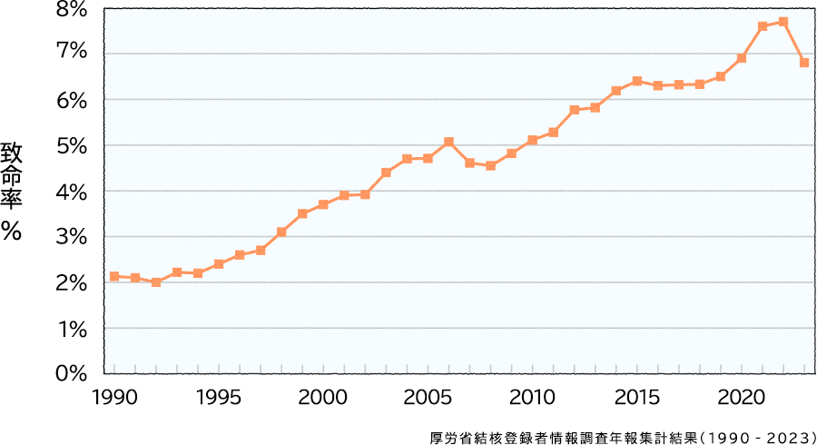 しかも結核と診断されて治療を始めた人の約25%の患者さんがその後結核を含む何らかの原因で命を落とし、また約7%が診断後1年以内に結核のため亡くなっています(図3)。図3 結核患者致命率の推移(登録1年以内の結核死亡/新登録患者数、1990-2023)