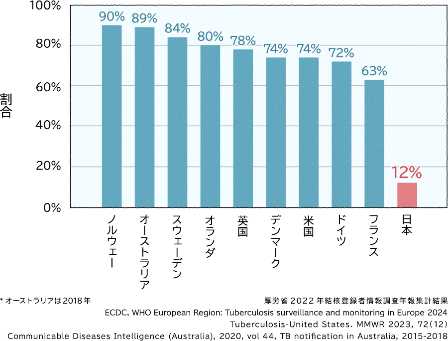 日本よりも結核がはるかに多い発展途上国で生まれ育った人々が日本にきて結核を発病する例が増えており、2023年には日本で発生する患者の16%を超え、とくに20~29歳では85%にも達します。多くの欧米先進国ではこの割合は既に50~90%となっていますが、日本もそうした状況に備える必要がますます大きくなっています。(図4、図5)