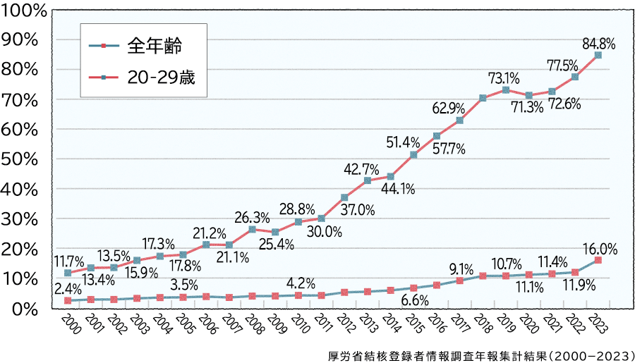 (2000-2023年、全結核、全年齢VS20-29歳)