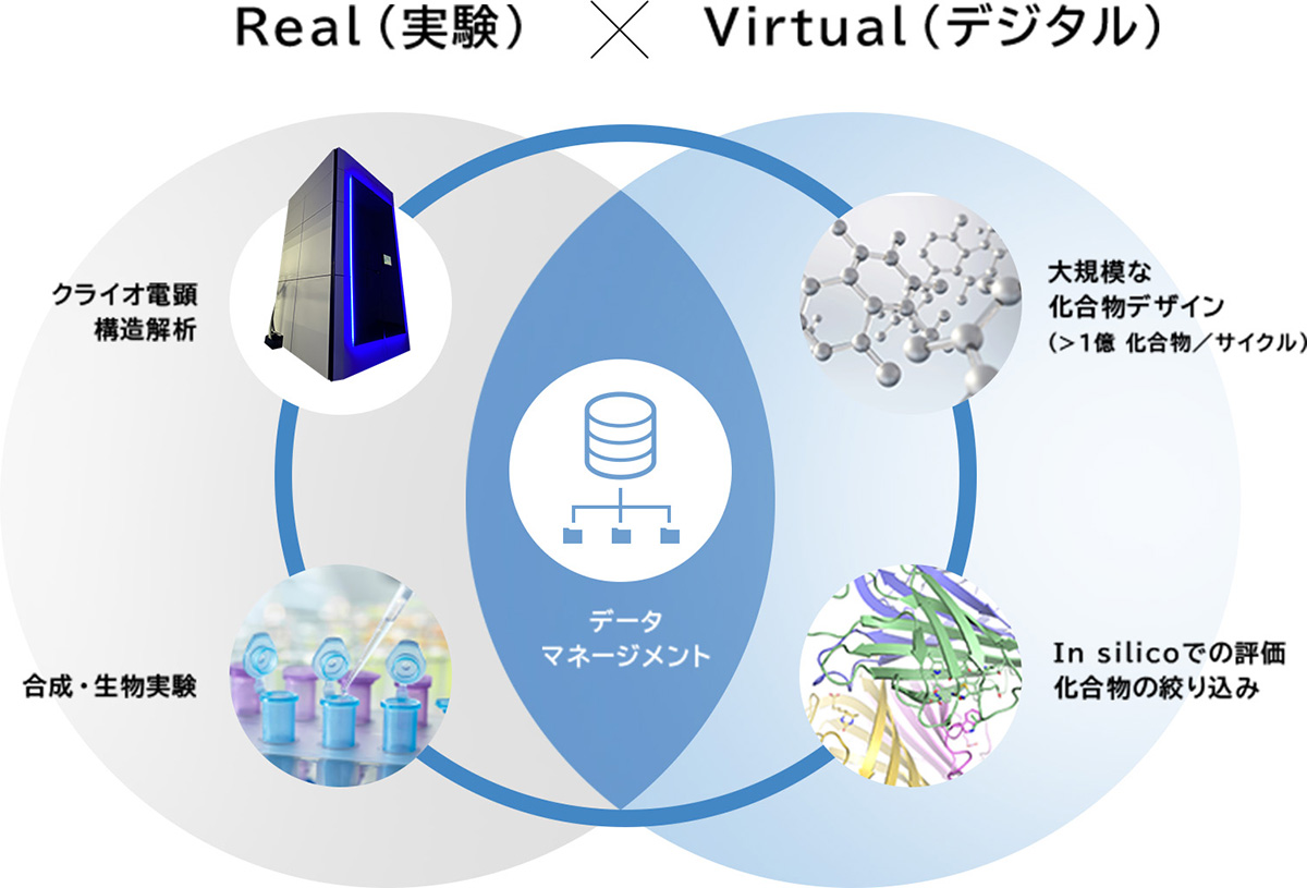 大塚製薬ではクライオ電子顕微鏡等から得られた構造情報を基に、AIやデジタル技術を活用して大規模な化合物デザインの作成と薬剤としての活性や物性の評価を行い、有望な化合物の絞り込みを行っています。