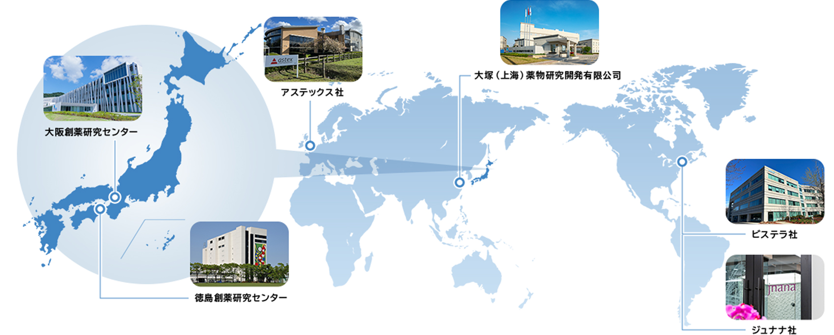 徳島県で始まった大塚製薬の創薬研究は、現在イギリス、アメリカ、中国の4か国にある自社の創薬研究所で行っています。徳島創薬研究センターの低分子化合物創薬、英国アステックス社のフラグメント創薬技術、米国ビステラ社の抗体創薬技術に加え、米国ジュナナ社のケモプロテオミクスや大阪創薬研究センターの近年進展が著しい遺伝子細胞治療薬、特にCAR-T、AAVを用いたベクター化抗体などのバイオロジクスの創薬研究など、各研究所が連携しながら革新的な医薬品の創出を目指します。