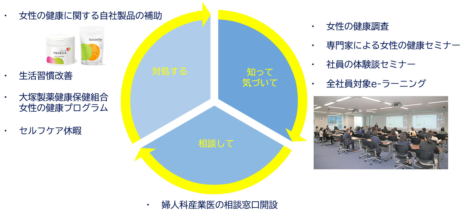 女性の健康に関する社内セミナーなど「知って・気づく」機会の提供、「婦人科産業医の「相談窓口」の開設、「対処する」ための各種実践プログラムの実施や自社製品の補助を行っています。さらに、生理で辛い時や更年期症状の治療時、不妊治療や性別適合手術など男女問わず利用できるセルフケア休暇という制度を設けています。