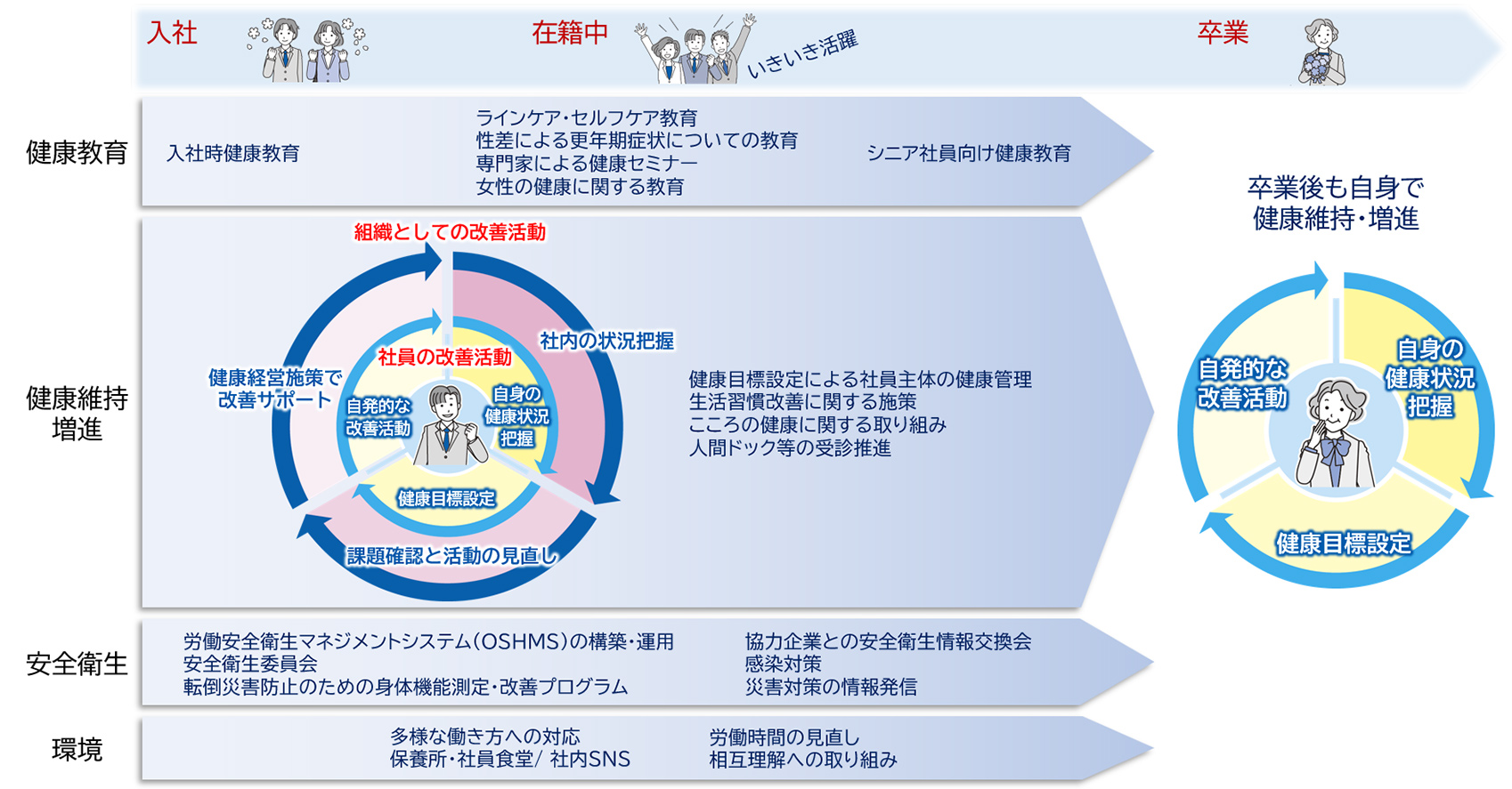社員が主体的に健康維持・増進に取り組むことにより活躍の場を広げ、充実した日々が送れるよう、会社はサポート役として活動を行っています。