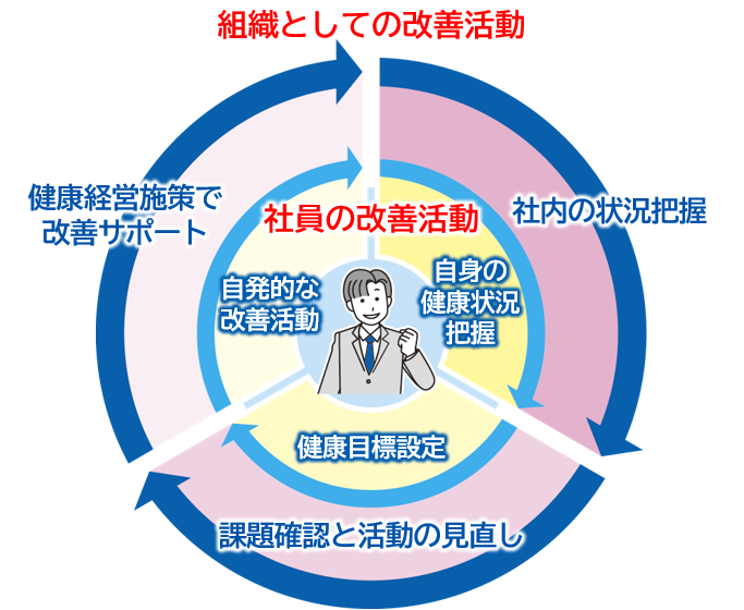 会社は、社内の状況を把握し、社員の改善活動をサポートする形で健康施策を行います。