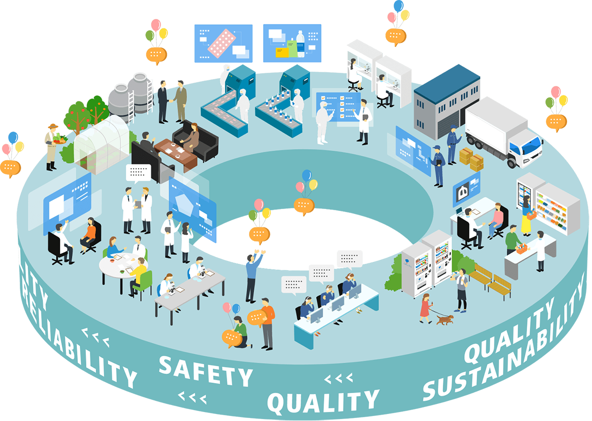 私たちは、サステナブルな社会の実現のために、研究開発、調達、生産、流通、販売、お客様とのコミュニケーションに至るサプライチェーンのすべての段階で、社会課題解決への取り組み、持続可能性を追求しながら、品質・安全性保証体制の確立に努めています。