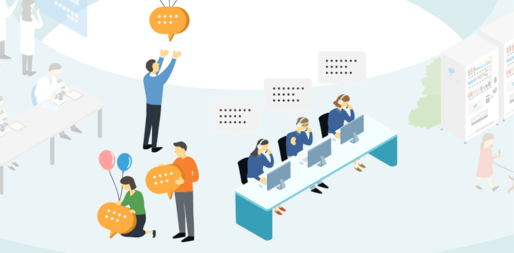 飲料、食品、サプリメントについてのお客様からのお問い合わせやご指摘をお受けしております。お客様からのお申し出は国内数か所のサテライト拠点で伺い、迅速かつ丁寧に対応をいたします。「お客様の声」は関連部署で共有し、お客様の信頼に応えるための企業活動に反映されています。今後の製品設計に活かしていくために、お客様からの要望などの声を関連部署に共有する会議を定期的に行っています。